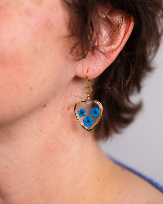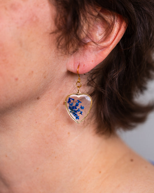 Handmade gold-plated clear heart-shaped earrings with blue flowers