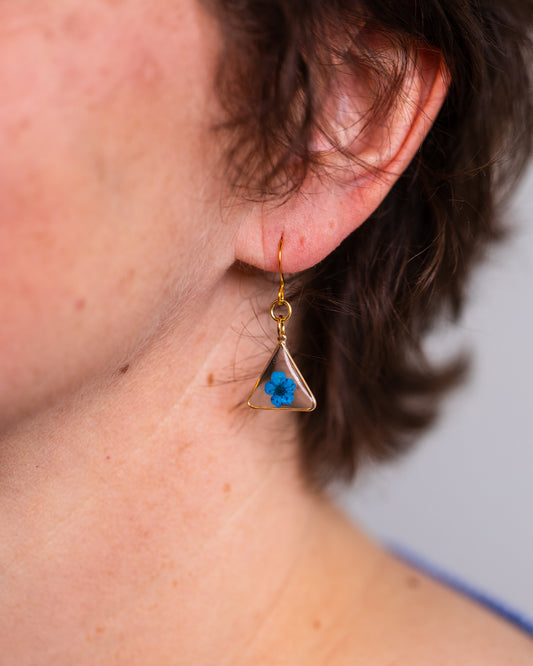 Handmade stainless steel teardrop earrings with blue dried flowers