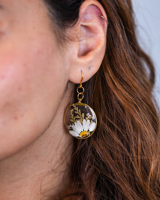 Handmade gold-plated pink and clear earrings with genuine flowers