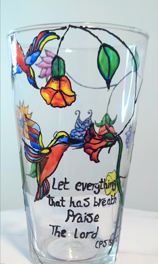 Vase en verre peint à la main personnalisé avec des perroquets, des fleurs et des papillons colorés.