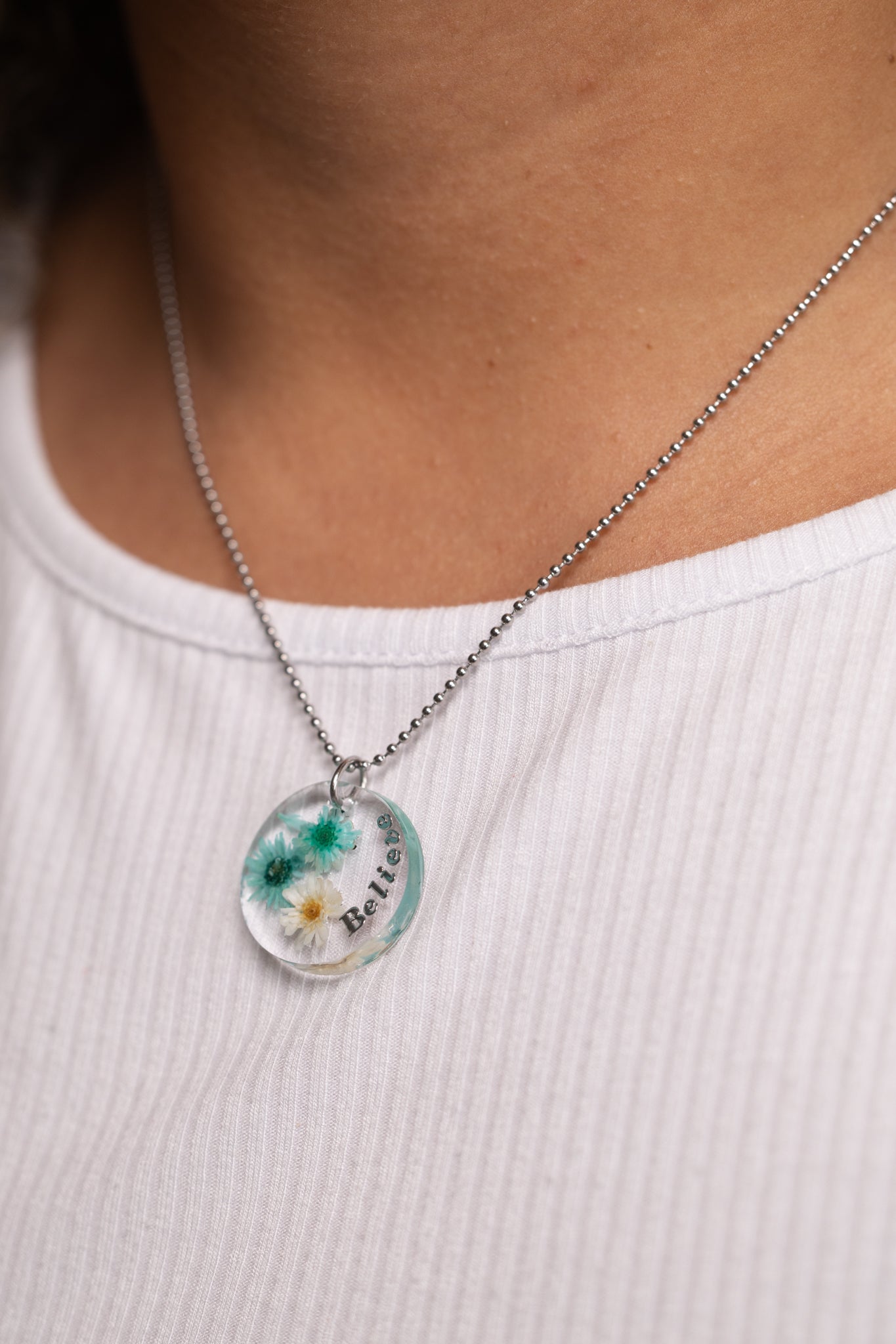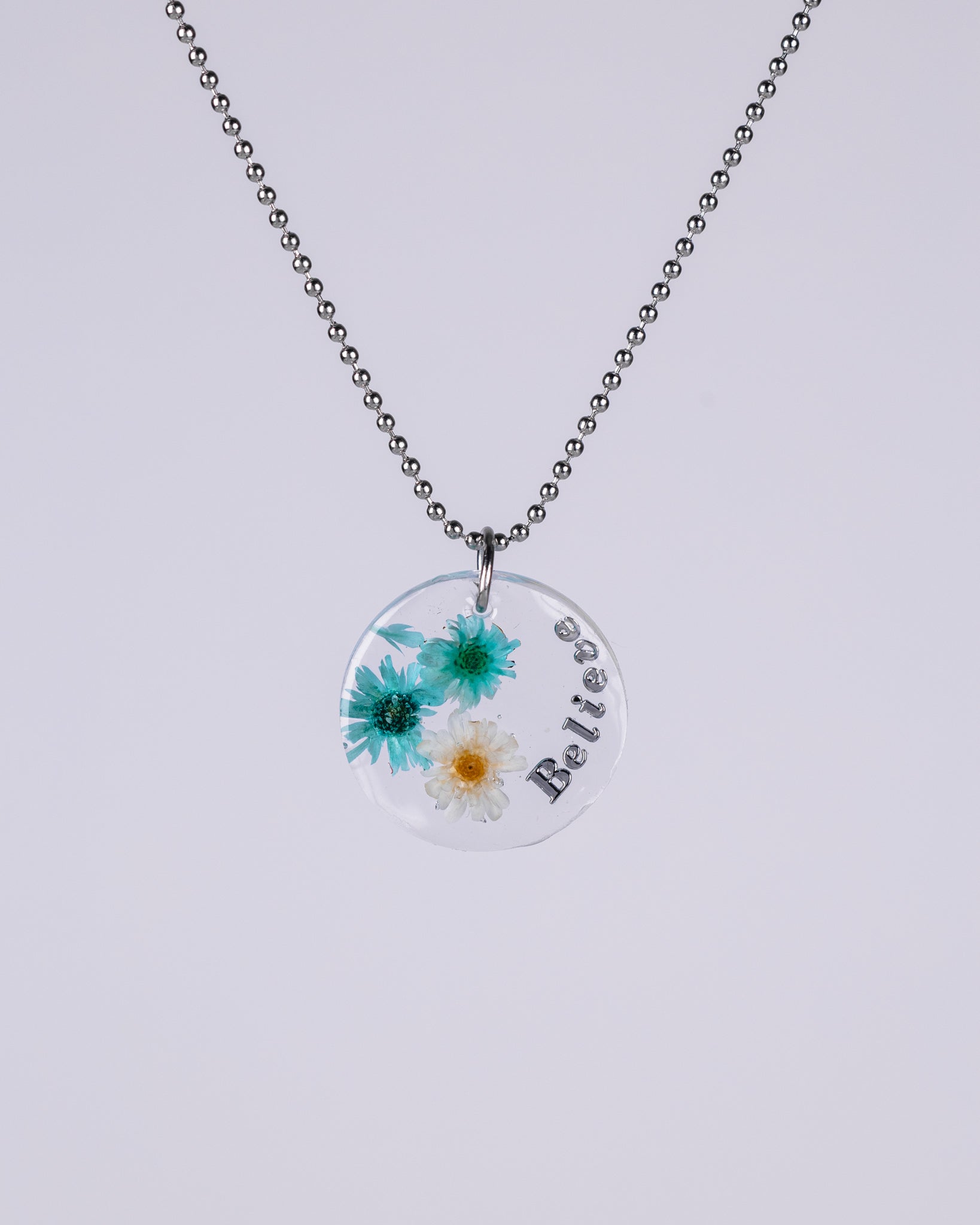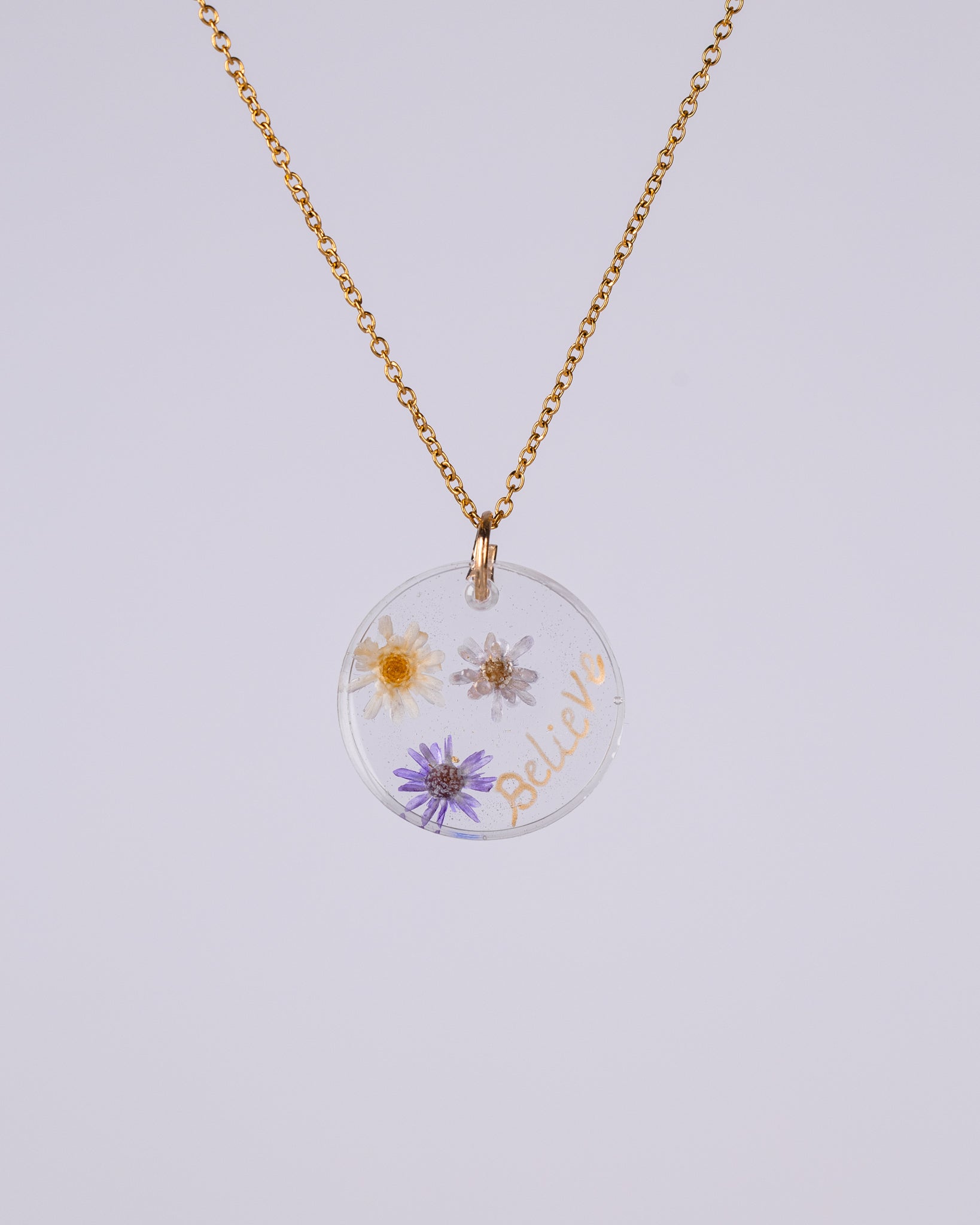 A stunning handmade gold-plated necklace filled with real dried flowers, preserved in crystal-clear resin. Personalise it with initials or a short word. A truly one-of-a-kind gift for a loved one or yourself. Crafted from high-quality gold-plated 316 surgical stainless steel, it ensures hypoallergenic comfort and enduring durability.