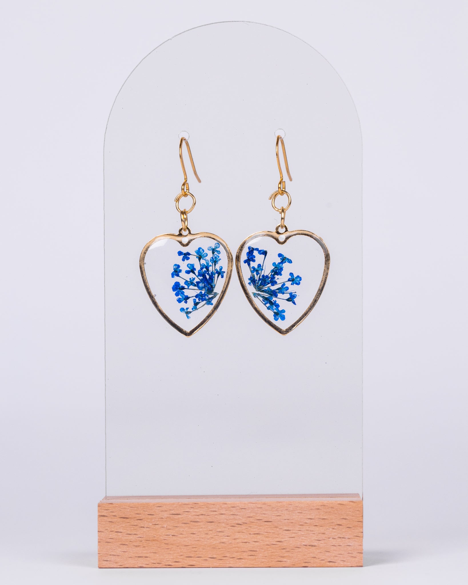 Experience the beauty of your individuality with these exquisite earrings adorned with vibrant blue flowers. Each piece is expertly handcrafted with high-quality resin, gold-plated detailing, and real pressed flowers, making it a true expression of style and uniqueness. Perfect for yourself or as a thoughtful gift, this set is a must-have for any fashion-forward wardrobe. Don't wait any longer, make it yours now!