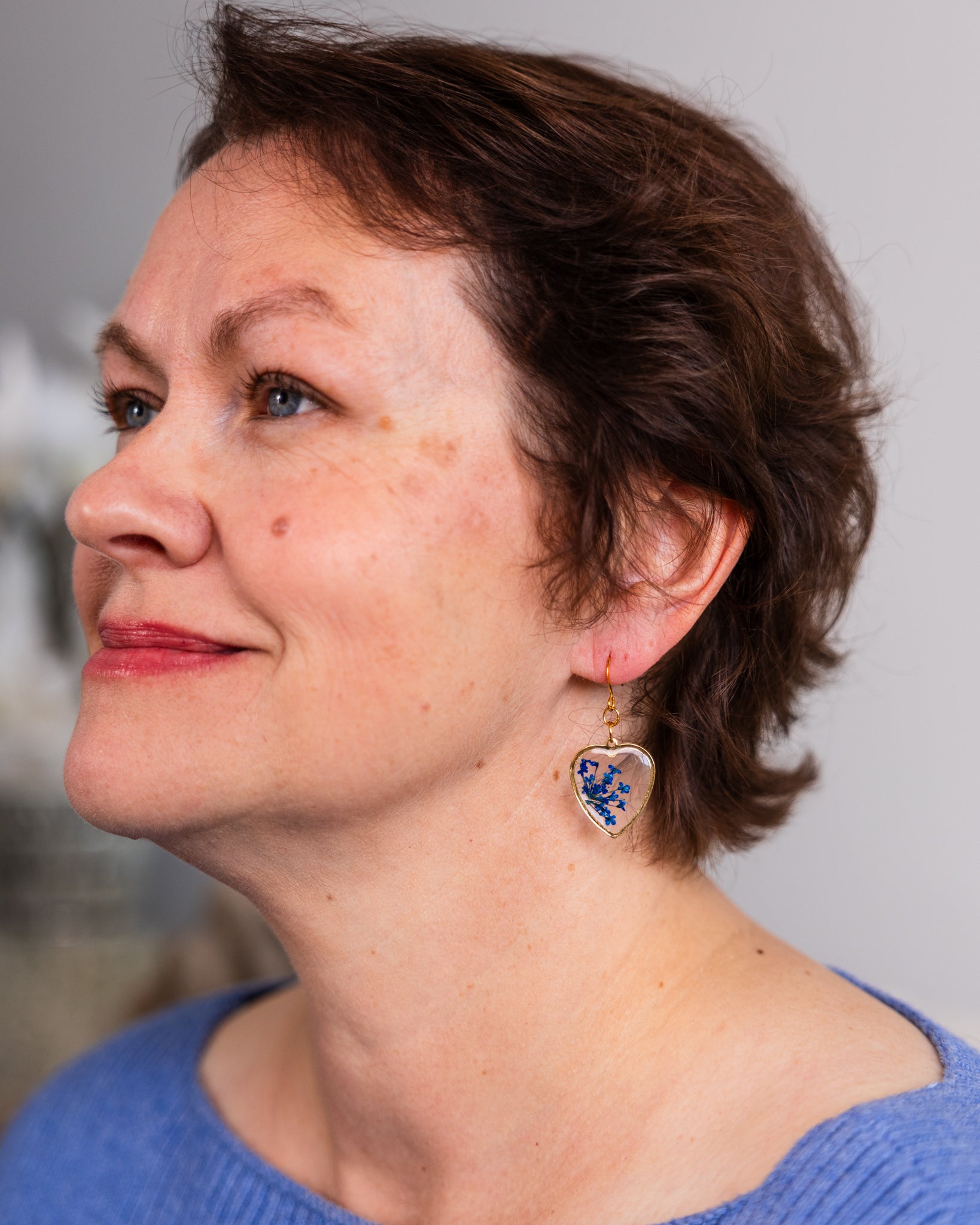 Handmade gold-plated clear heart-shaped earrings with blue flowers