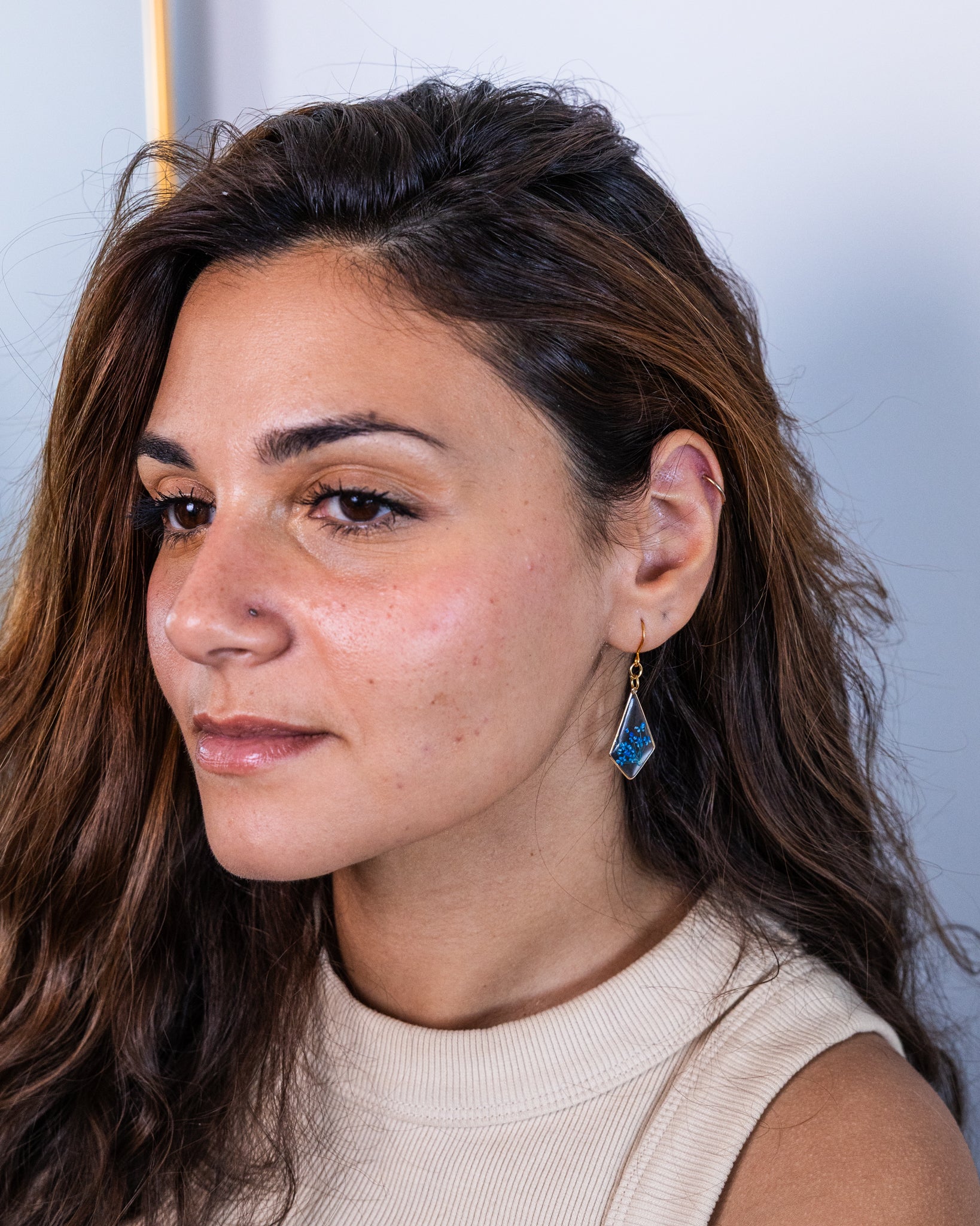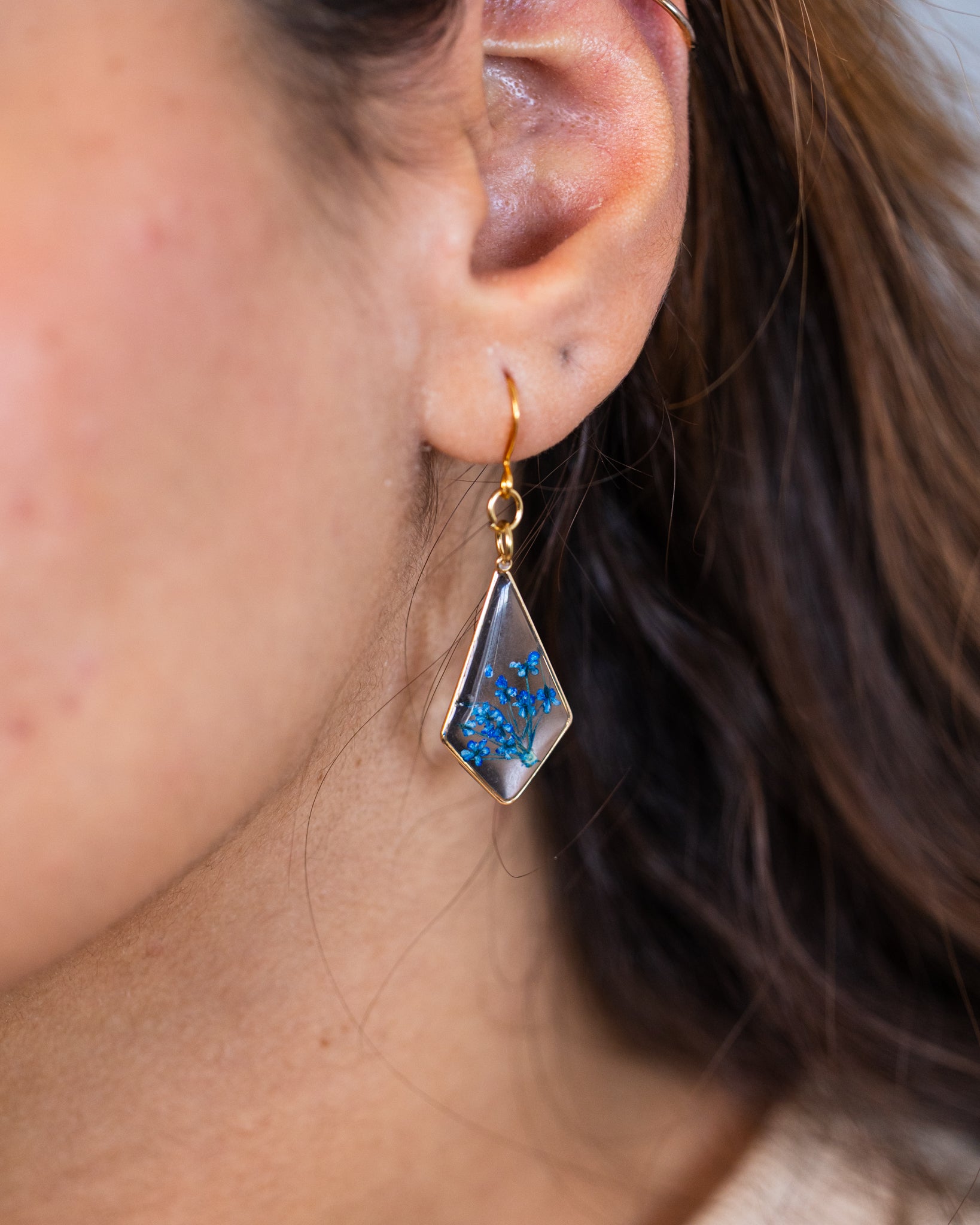 These handmade gold-plated diamond-shaped earrings feature a delicate arrangement of real blue flowers, preserved in clear resin. The sleek geometric design pairs beautifully with soft florals, offering a timeless blend of elegance and nature.
