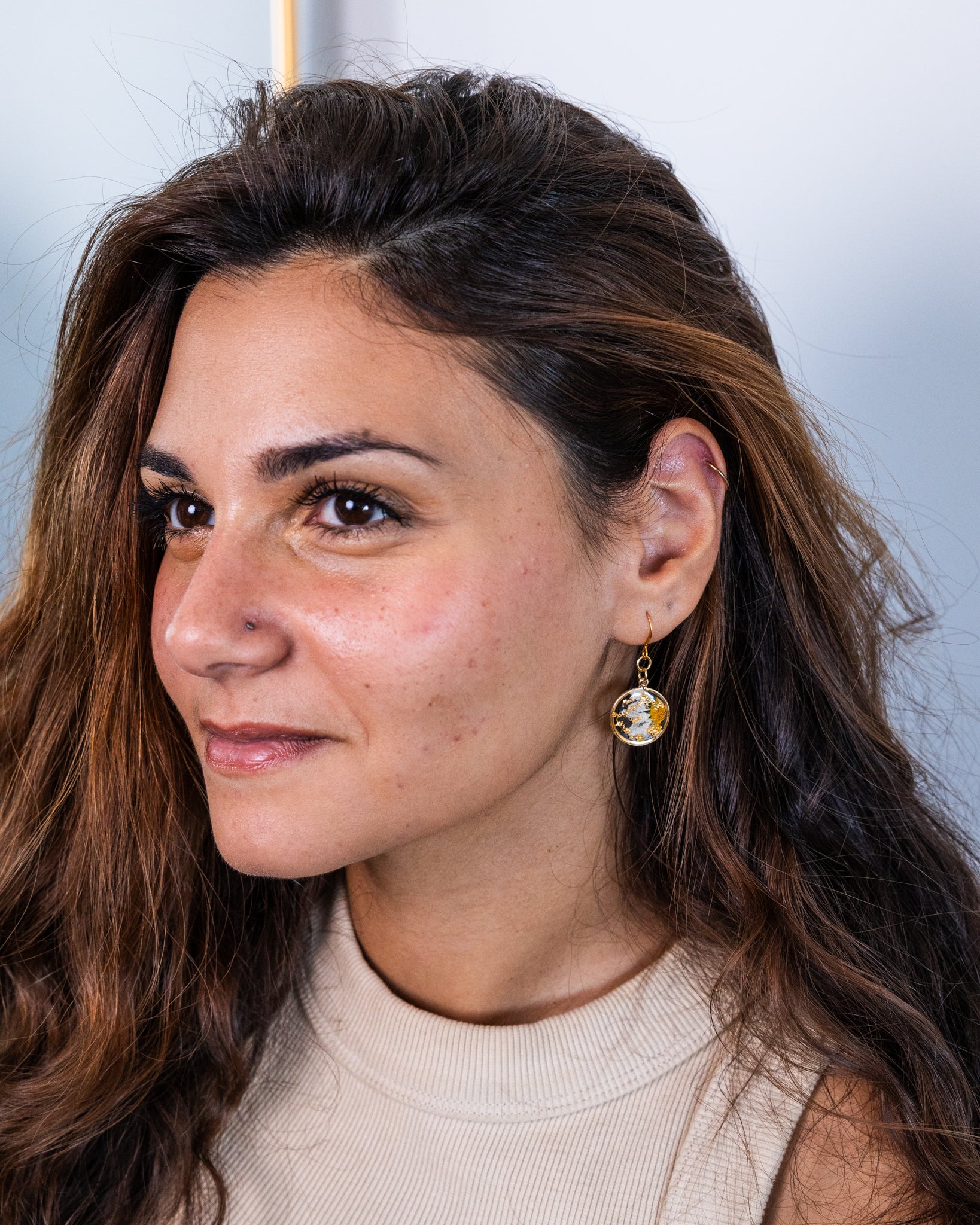 Delicate and charming, these small round daisy earrings are handmade with real flowers and finished in high-quality gold plating. The added gold accents bring a touch of luxury, making them the perfect blend of elegance and nature.