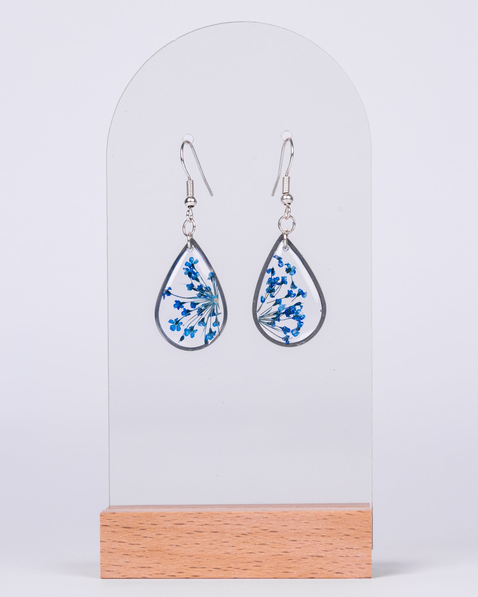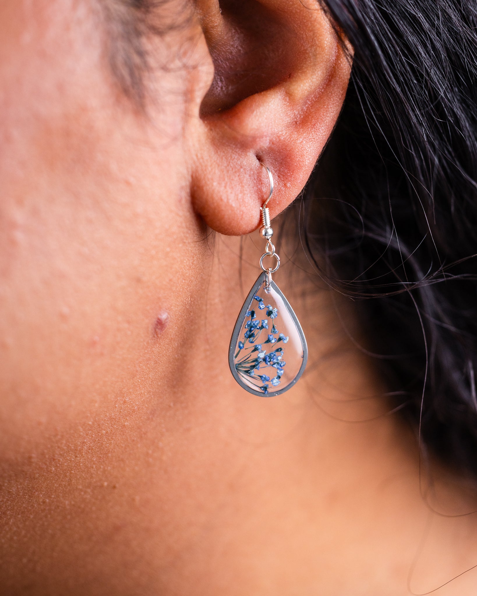 Handmade stainless steel teardrop earrings with blue dried flowers
