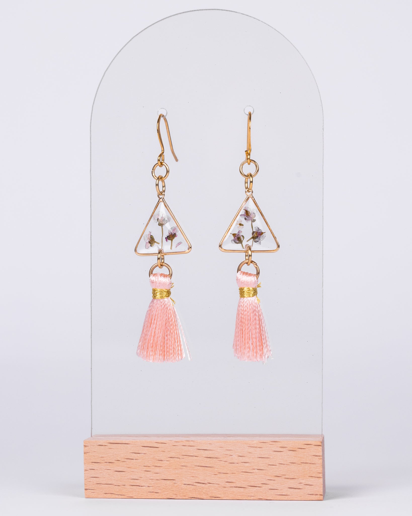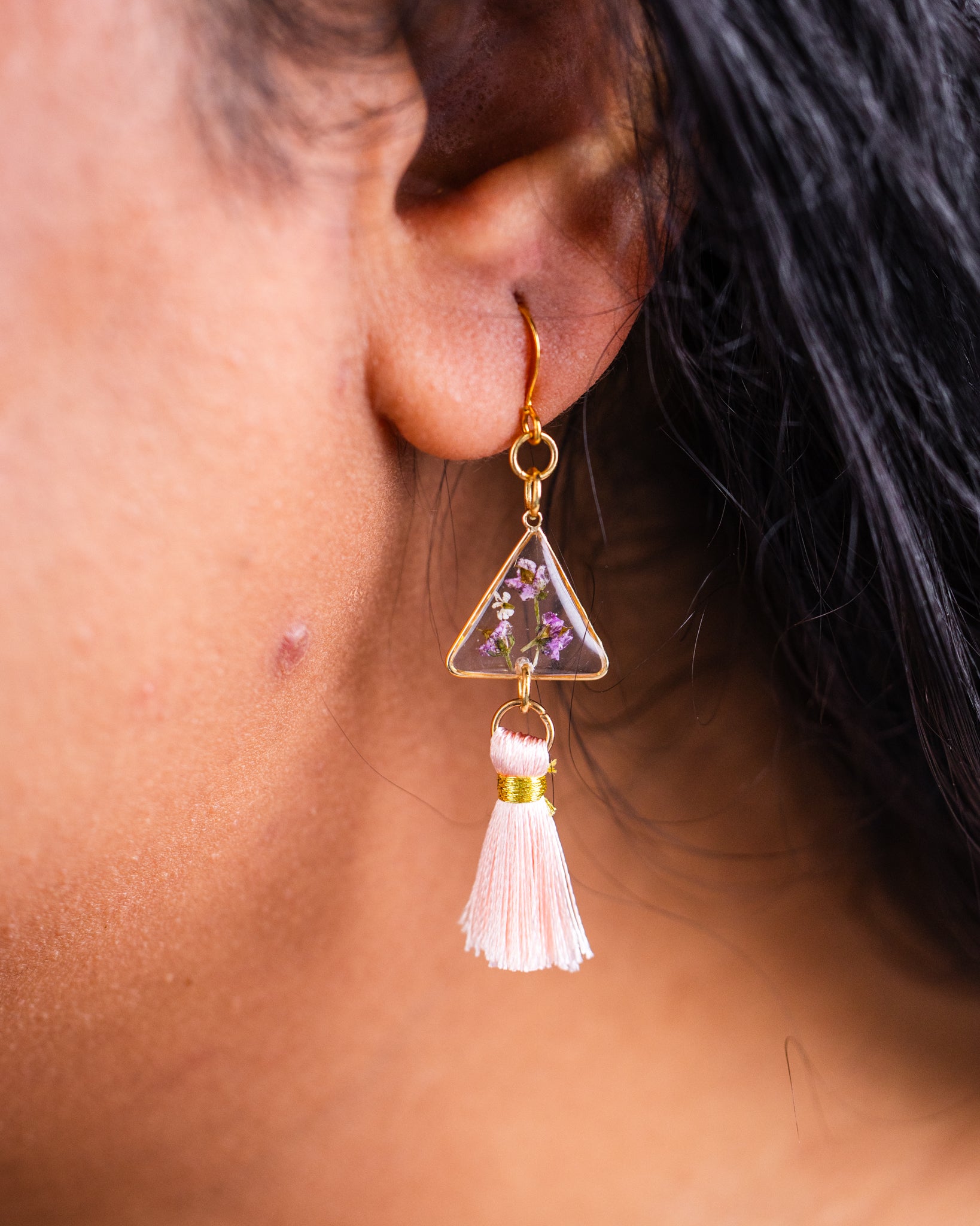 These handmade triangular earrings are a stunning mix of elegance and charm. Featuring real baby white flowers delicately preserved in clear resin, each earring is finished with soft pink tassels and a gold-plated frame for a playful yet sophisticated look.