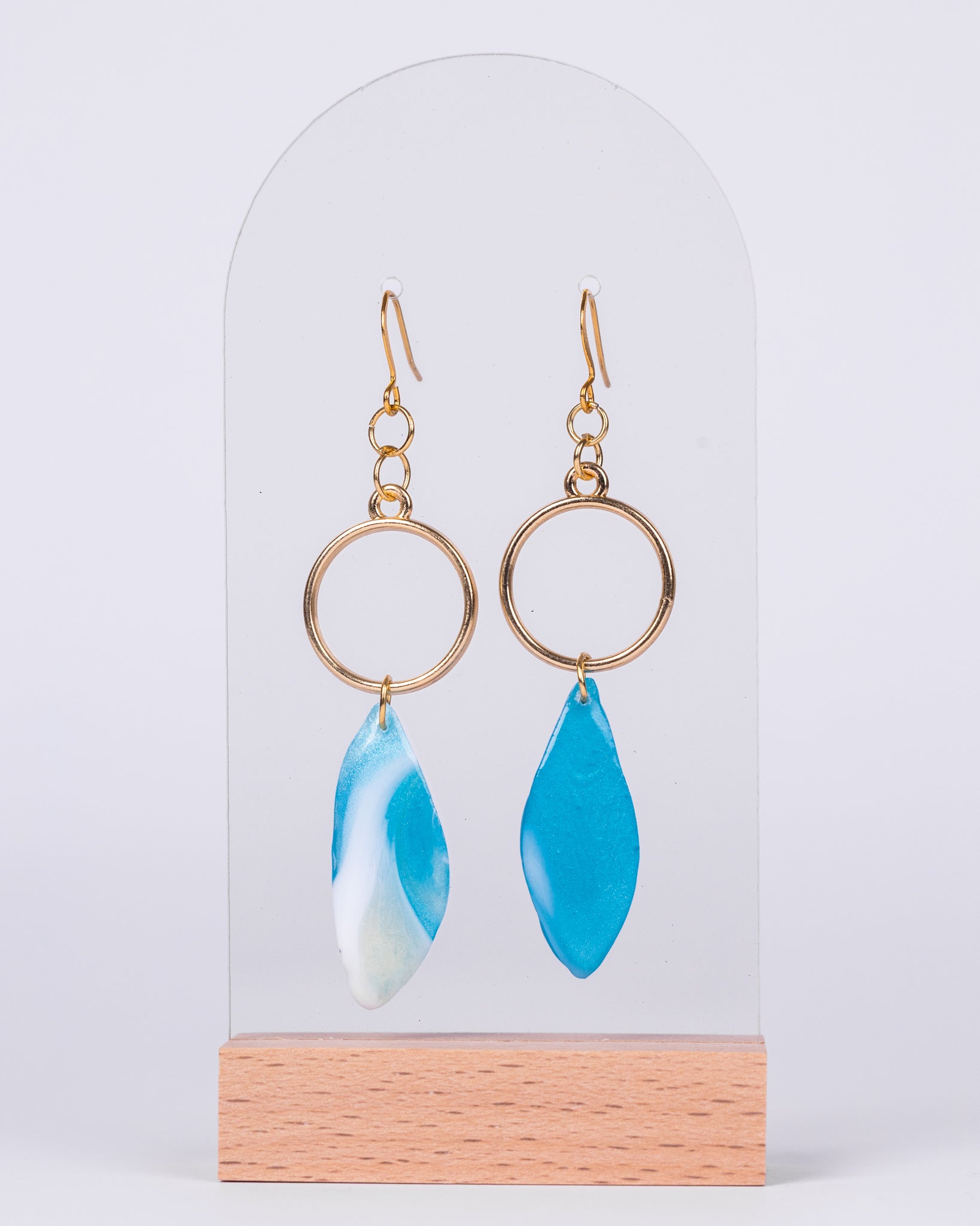 These handmade ocean resin earrings feature dreamy pearlescent swirls that mimic ocean waves. Crafted in Australia using premium resin and gold-plated jewellery, they’re bold yet lightweight — perfect for making a statement while staying connected to the sea.